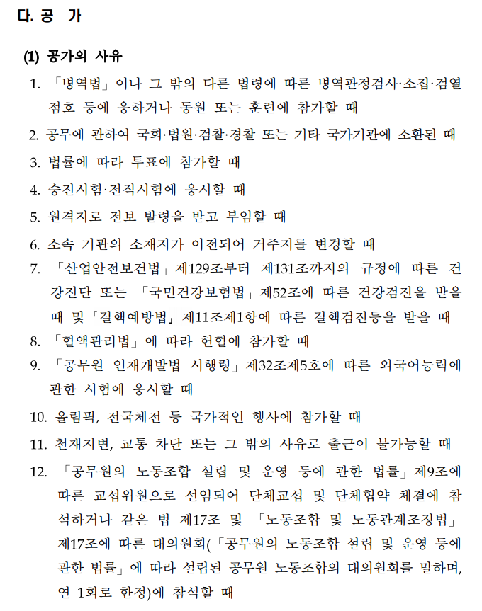 예규에서 인정하는 공가 사유는 다음과 같습니다.