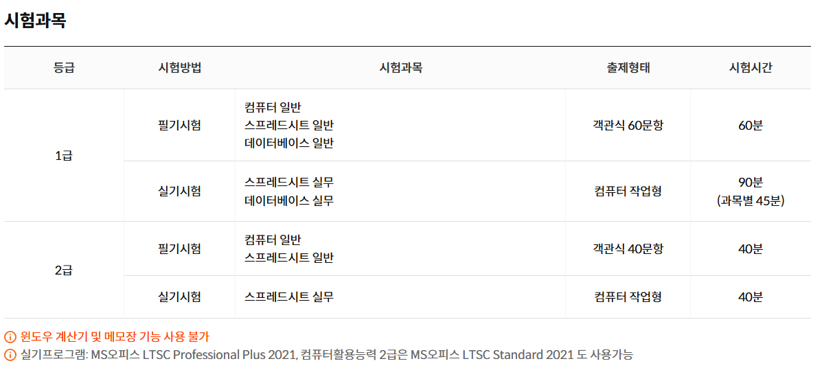 필기는 컴퓨터 일반, 스프레드시트, 데이터베이스 이론으로 구성되어 있으며 실기는 엑셀과 액세스를 활용한 실습 시험입니다.